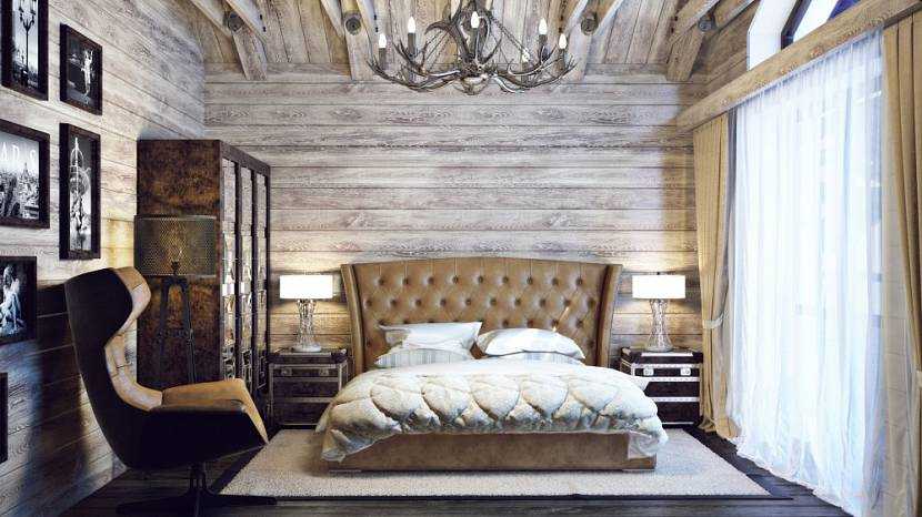В спальне устанавливают огромную кровать из шлифованного массива, украшенную резными узорами. Ковер с крупным ворсом является обязательной деталью зоны для сна. Стены из гладкого материала придают комнате домашний уют. Атмосфера спокойствия в пространстве достигается за счет мягкого света осветительных приборов и зашторенных окон.