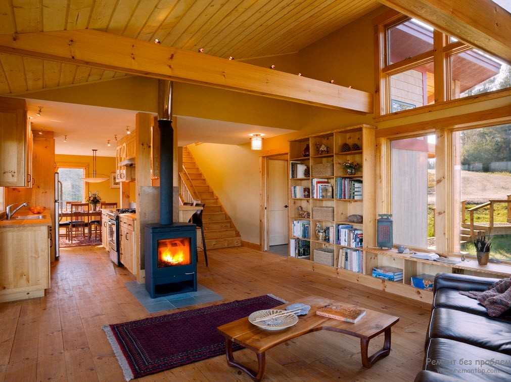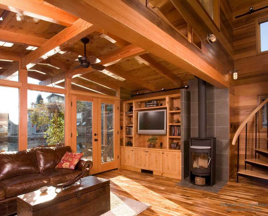 Как уже подчеркивалось выше, в деревянном доме можно создать интерьер практически в любом стиле. Скорее всего, вы будете склоняться к самому популярному в России стилю интерьера – модерну. Он достаточно простой, но в тоже время функциональный. Свет в комнаты попадает через большие не нагруженные тяжелыми портьерами окна. В таком интерьера будет комфортно и удобно.