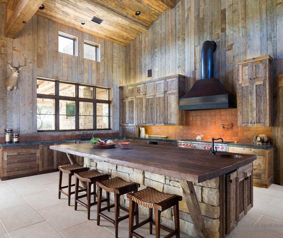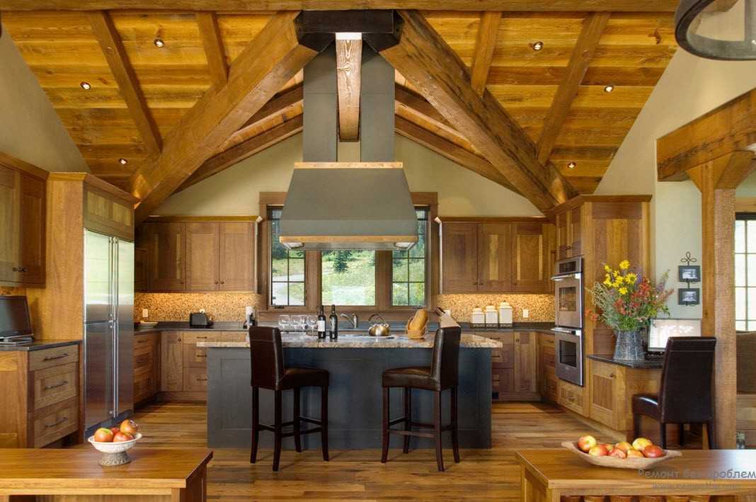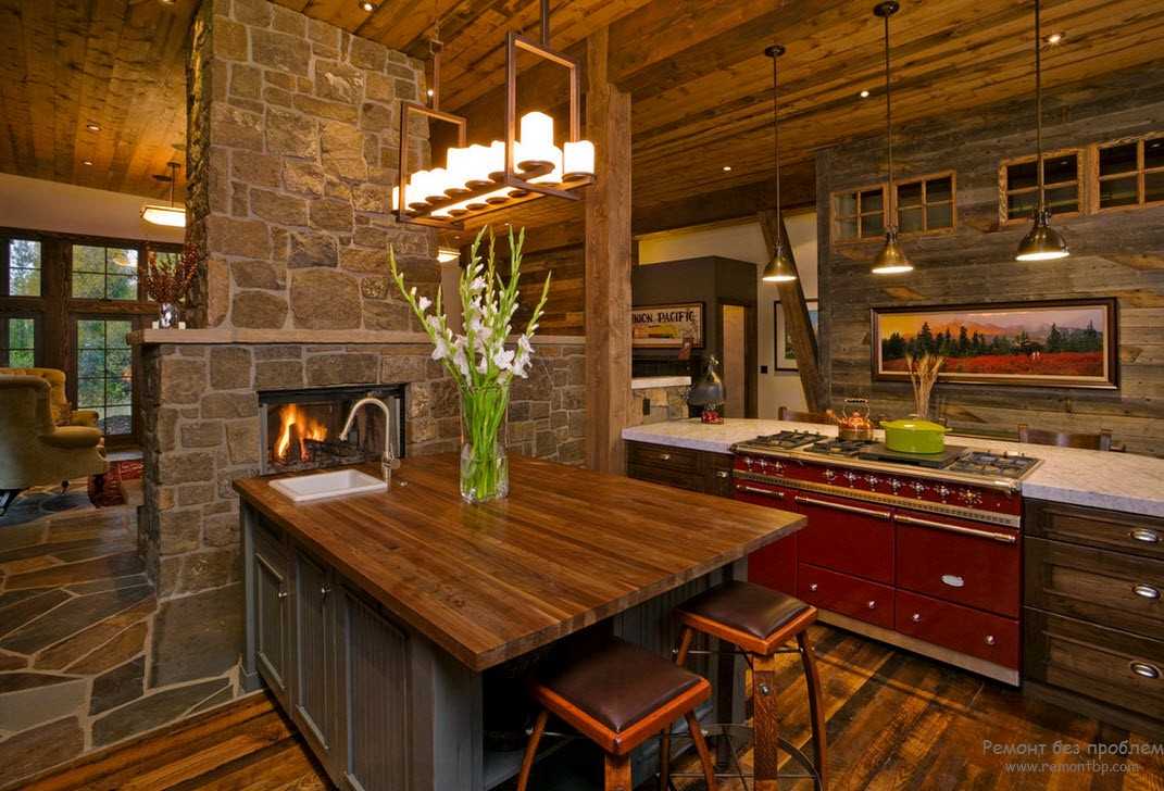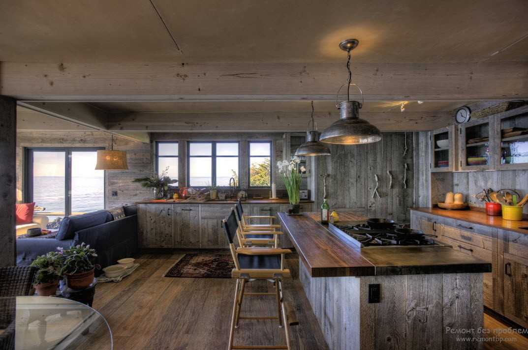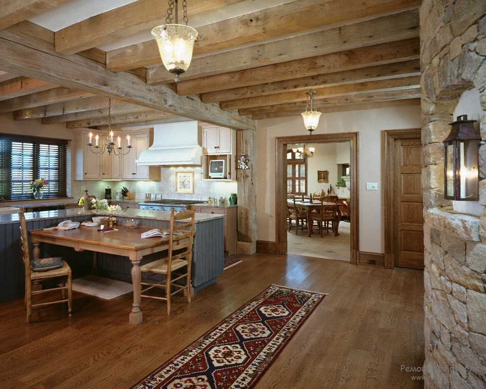 Деревянные стены не стоит штукатурить или облицовывать. Хорошо, если удастся оставить на виду деревянные потолочные балки. С них должны опускаться простые люстры в деревенском стиле.