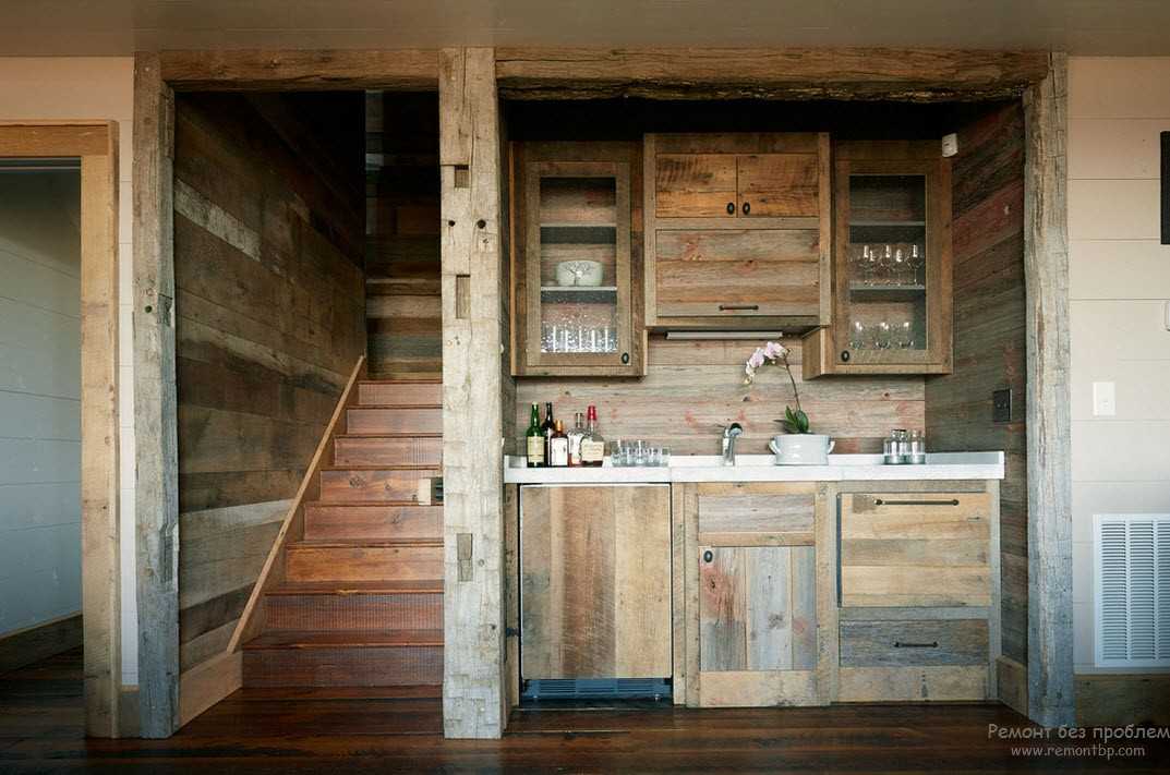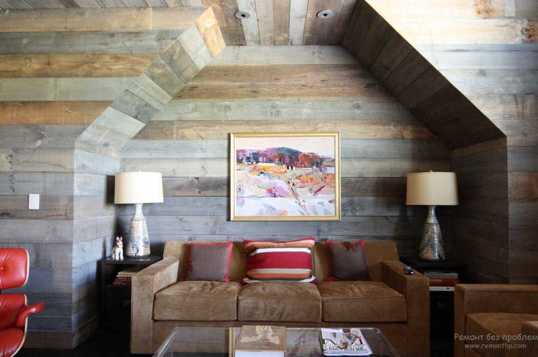В первом случае панелями обшивается вся площадь потолка и стен с соблюдением всех технологий. Во втором варианте осуществляется частичная обработка древесиной, сочетание имитации бруса с текстилем, обоями, стеклом.