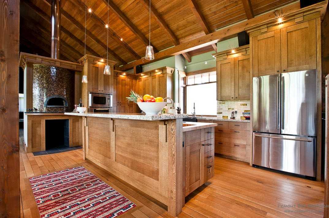 Брус хорошо сочетается с любыми другими натуральными материалами или их имитациями. На пол – паркет, доски, плитку, керамогранит или даже ламинат. Потолки можно оставить открытыми с балками – это впишется в лофт, прованс, скандинавский стиль, и даже в загородную классику.