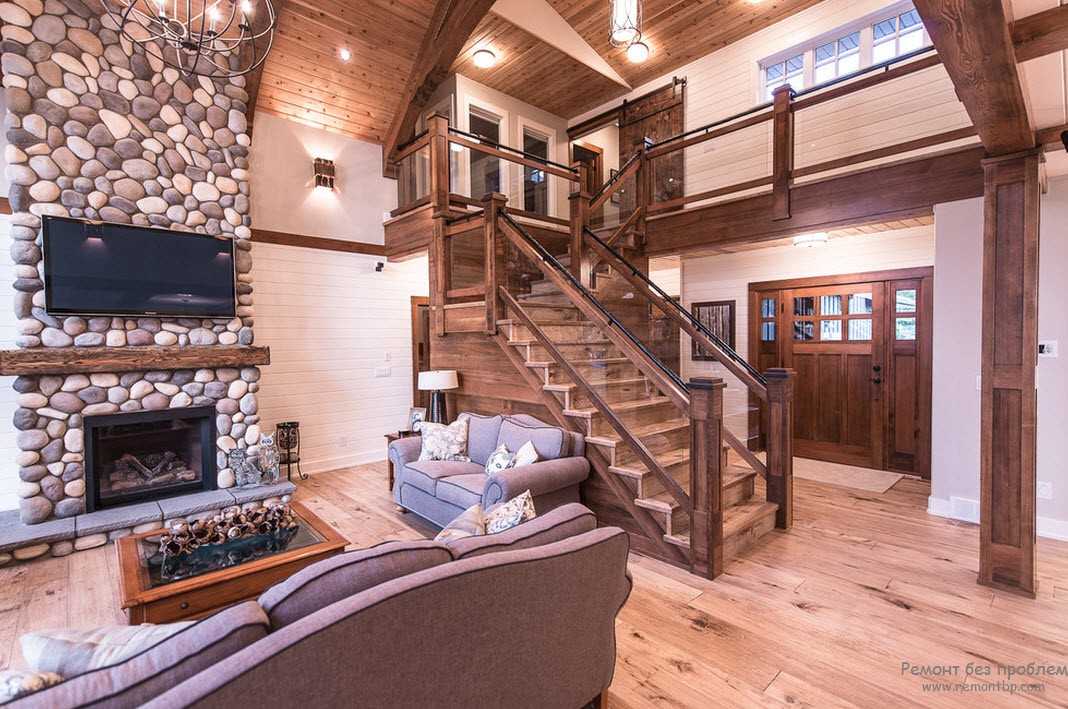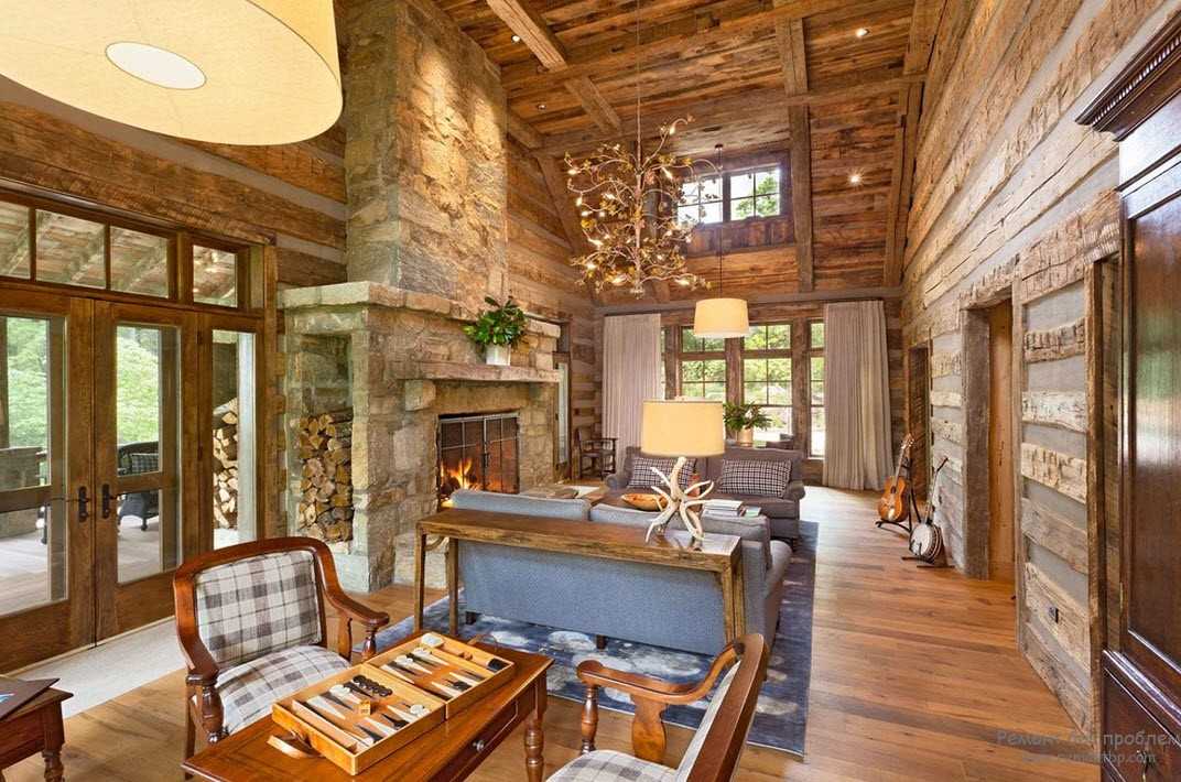На фото интерьер деревянного дома из бревна в современном «деревенском» стиле.