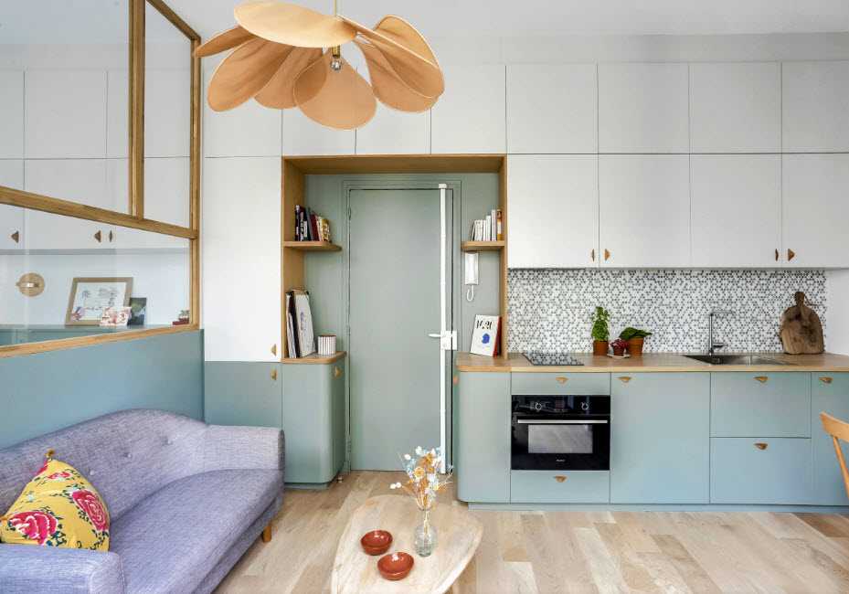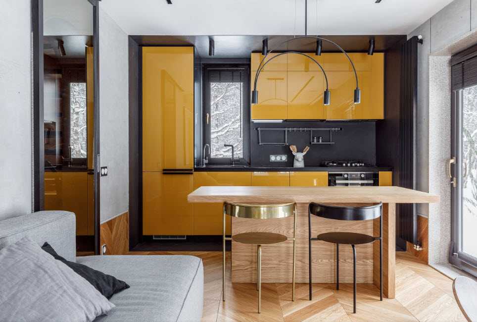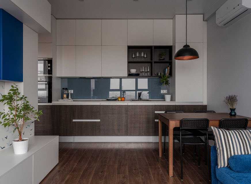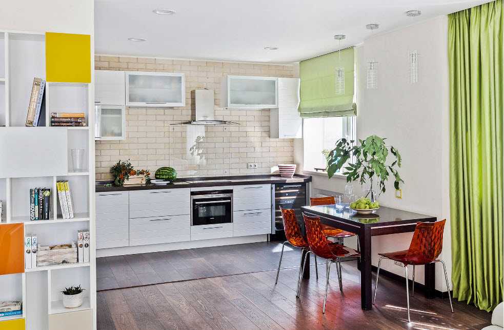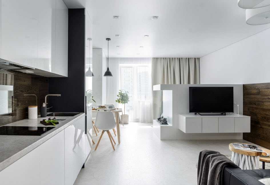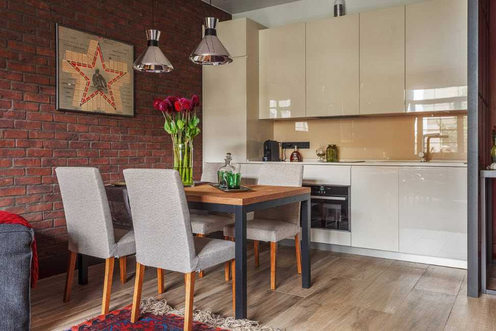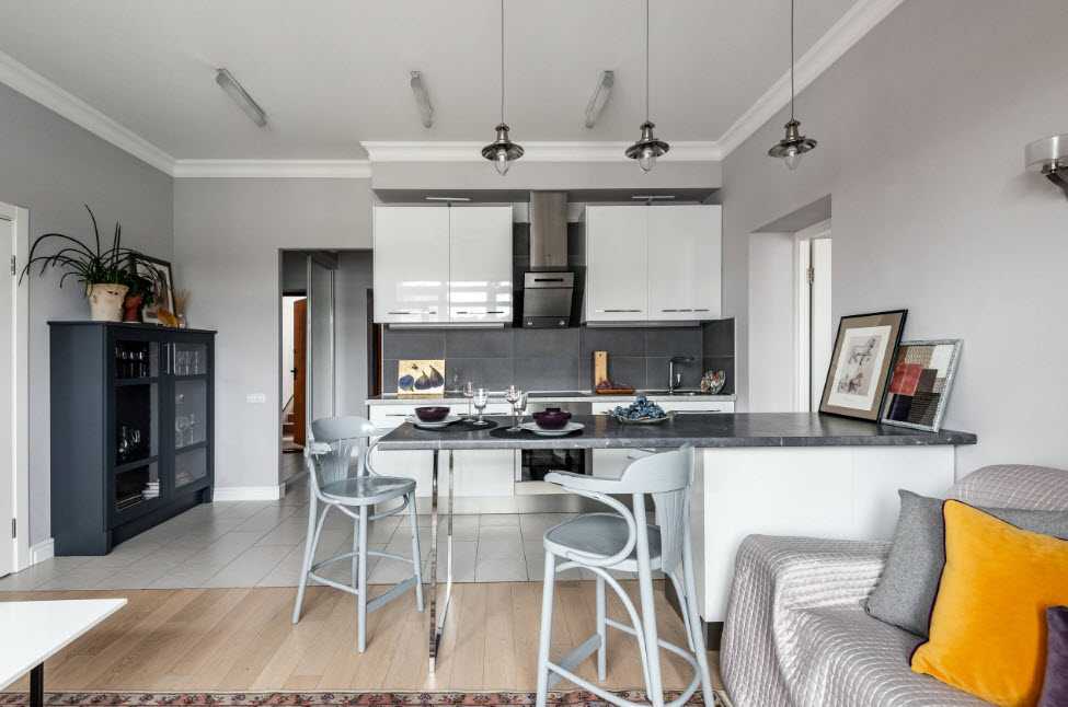 Если зона кухни наиболее важна и предназначена для всеобщих посиделок за одним столом членов семьи, друзей и родственников, тогда ей лучше отвести чуть больше половины помещения.