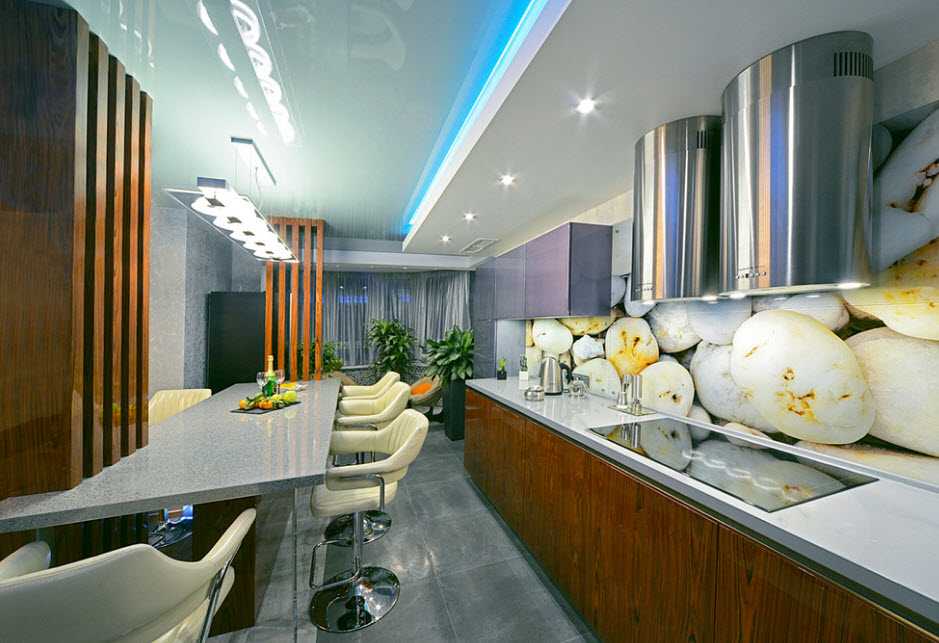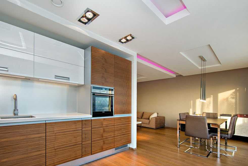 Особенно чувствительны в этом плане натяжные конструкции. Но и для них имеется решение: можно использовать точечные светильники или светодиодную ленту. Общий свет используется для приема гостей, проведения домашних праздников и торжественных мероприятий.