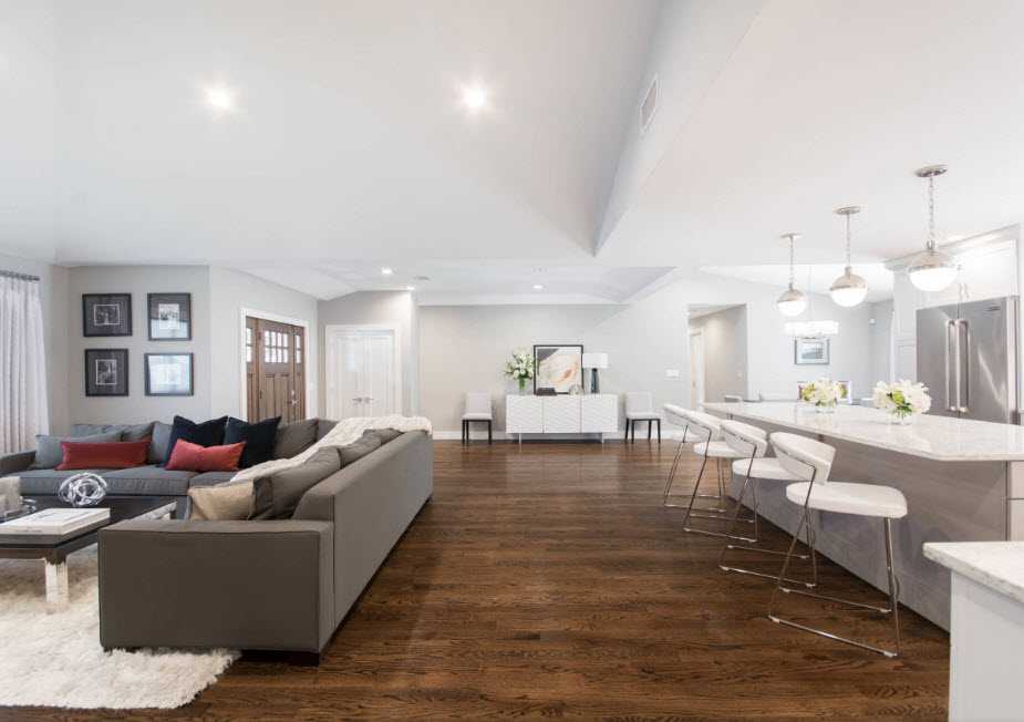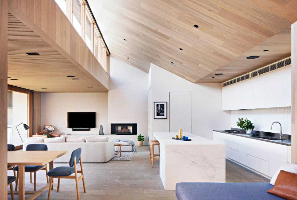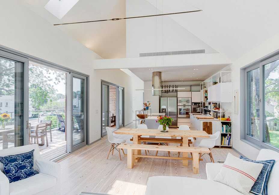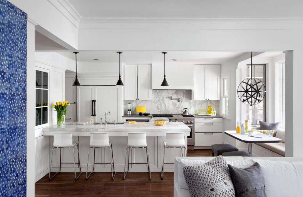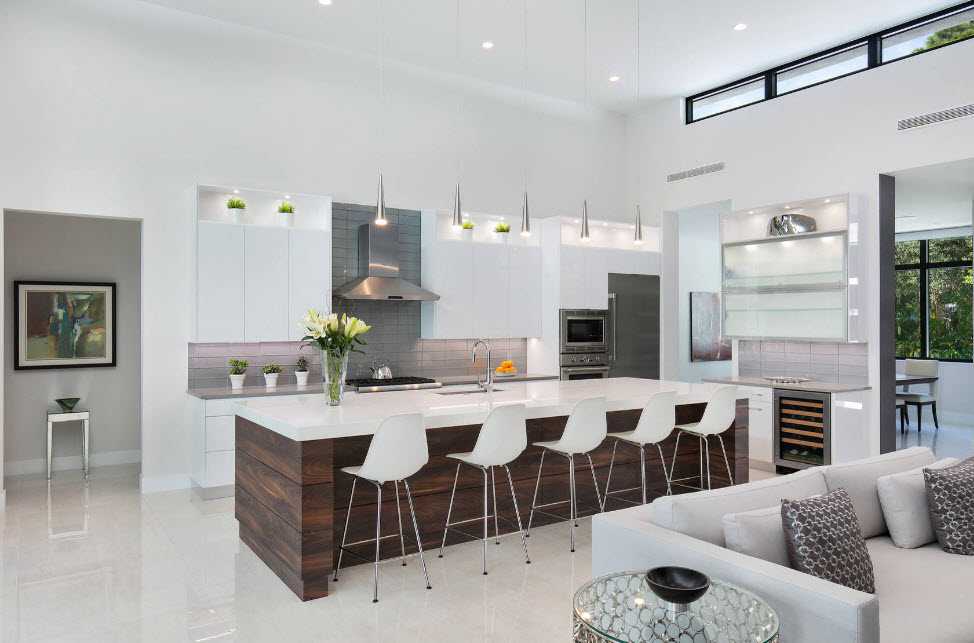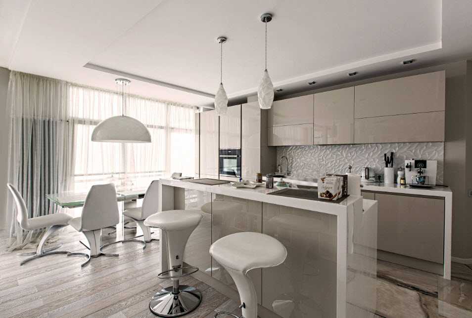 Ниже представлены фото, демонстрирующие дизайн кухни, совмещенной с гостиной и столовой в частном и загородном доме.