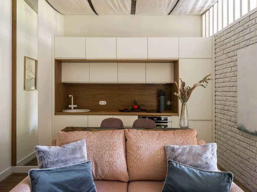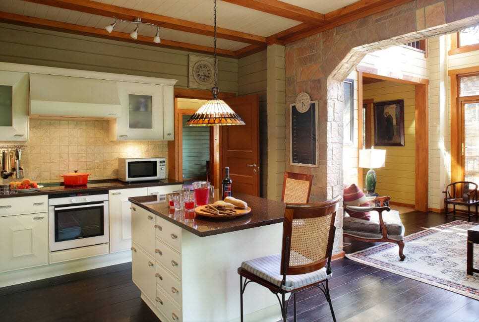 В дачном доме редко хватает места, и потому иногда используется сочетание кухни с гостиной в одном помещении. Одна крупная комната неизменно светлее и уютнее, чем две относительно мелких. Но учтите, что такой подход усложняет поддержание чистоты и порядка. В брусовом жилище суммарная площадь кухонь, гостиных и столовых зон не может быть менее 60 кв. м, сколько места уделить каждой из них – решайте сами.