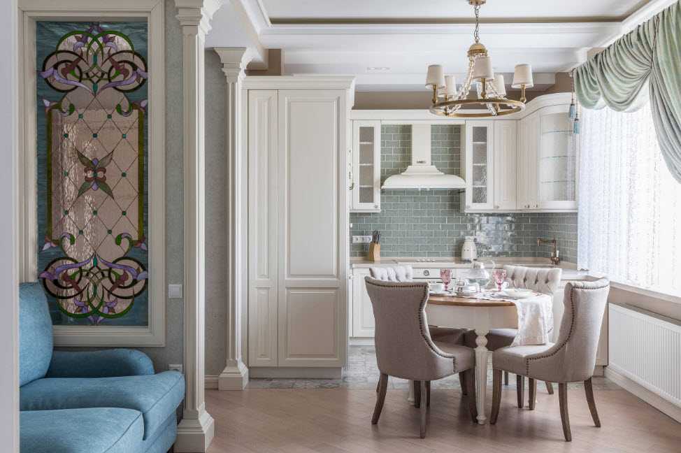 Модерн – классическая кухня с ассиметрично растянутыми дверьми и мебелью, изогнутыми и плавными линиями. Витражи заменяют стекла, создавая со стенами и потолком сложные оптические иллюзии. В цветовой гамме преобладают белый и голубой цвета.