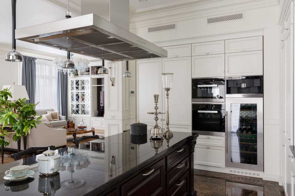 В случае, когда семейная традиция – это гостиная-столовая, кухне отводят только необходимый минимум.