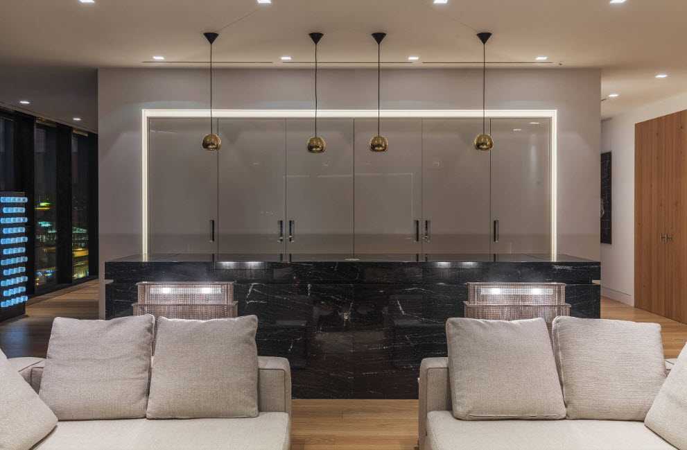 Встроенный в декорированную светлым кирпичом перегородку биокамин с панорамным остеклением визуально облегчает масштабную конструкцию, и она не кажется громоздкой. От этого интерьер кухни-гостиной в современном стиле только выигрывает. А толстое закаленное стекло делает эксплуатацию камина безопасной.