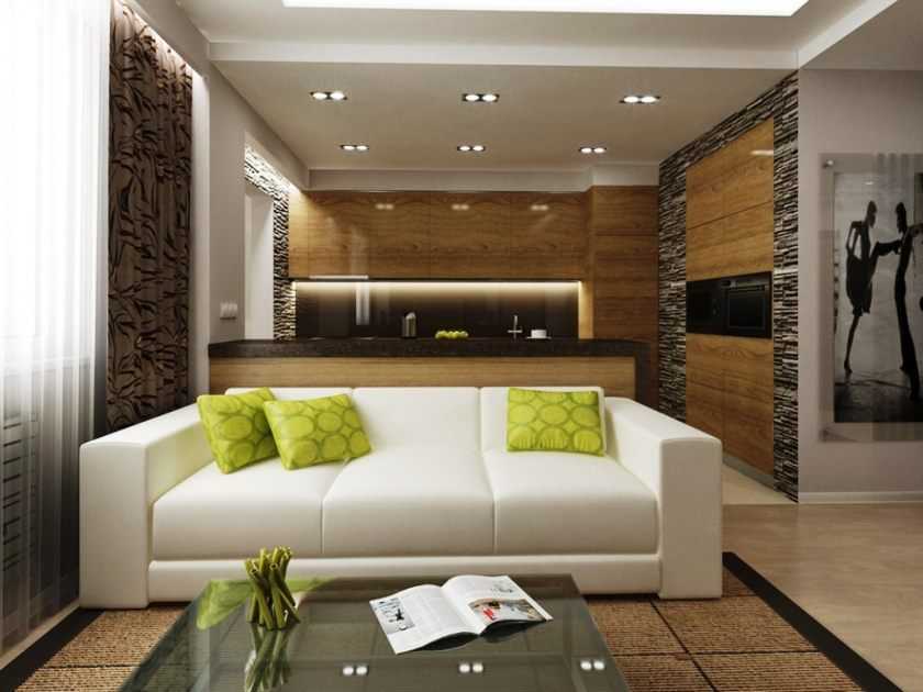 Модной получится квартира с площадью 40 кв. м, в которой зал и кухня объединены в одно пространство и разделены небольшим столом. Можно прибегнуть к отделке в стиле лофт: имитации бетонных поверхностей, кирпичной кладке, деревянным покрытиям пола, белому потолку. В интерьере могут сочетаться темные, белые и серые краски. Диван лучше подобрать темно-серый. Зону гостиной можно «замкнуть» открытой спальной территорией с акцентной стеной салатового оттенка. Тут можно расположить двуспальную деревянную кровать с контрастным постельным бельем.