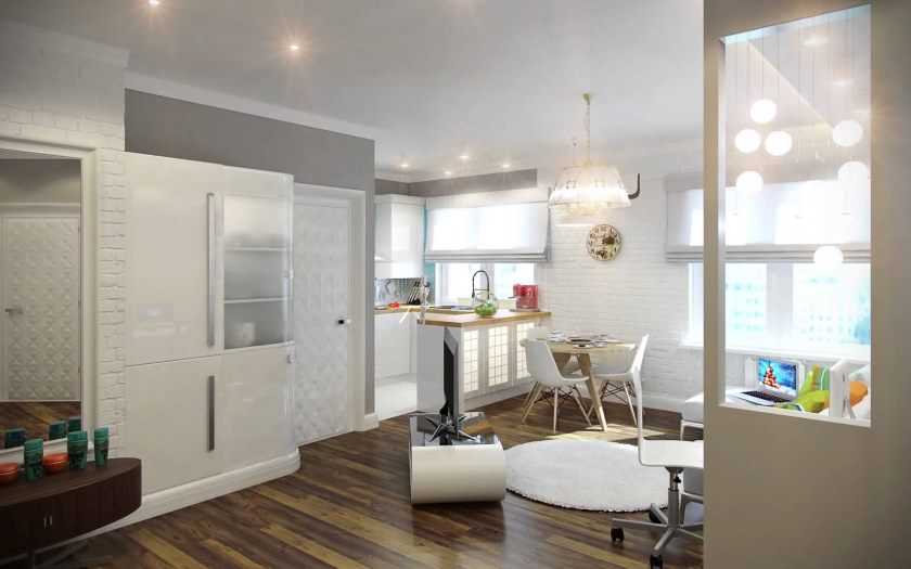 Если такая квартира находится в новостройке, то можно расширить пространство, задействовав в этом лоджию. Для этого ее нужно утеплить и остеклить, после чего она сможет служить обеденной зоной или рабочим кабинетом. Это даст возможность разгрузить кухню, а освободившиеся квадратные метры использовать с максимальной пользой.
