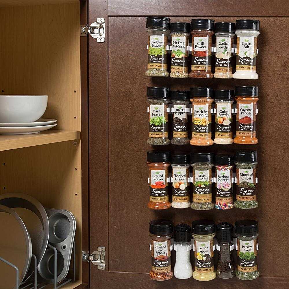 Множество маленьких баночек со специями есть на кухне каждой хозяйки. Часто они стоят на столе, чтобы быть всегда под рукой. И это тоже загромождает пространство. Пусть они стоят на специальной подставке. Например, на той, что прикреплена к дверце шкафа с внутренней стороны.