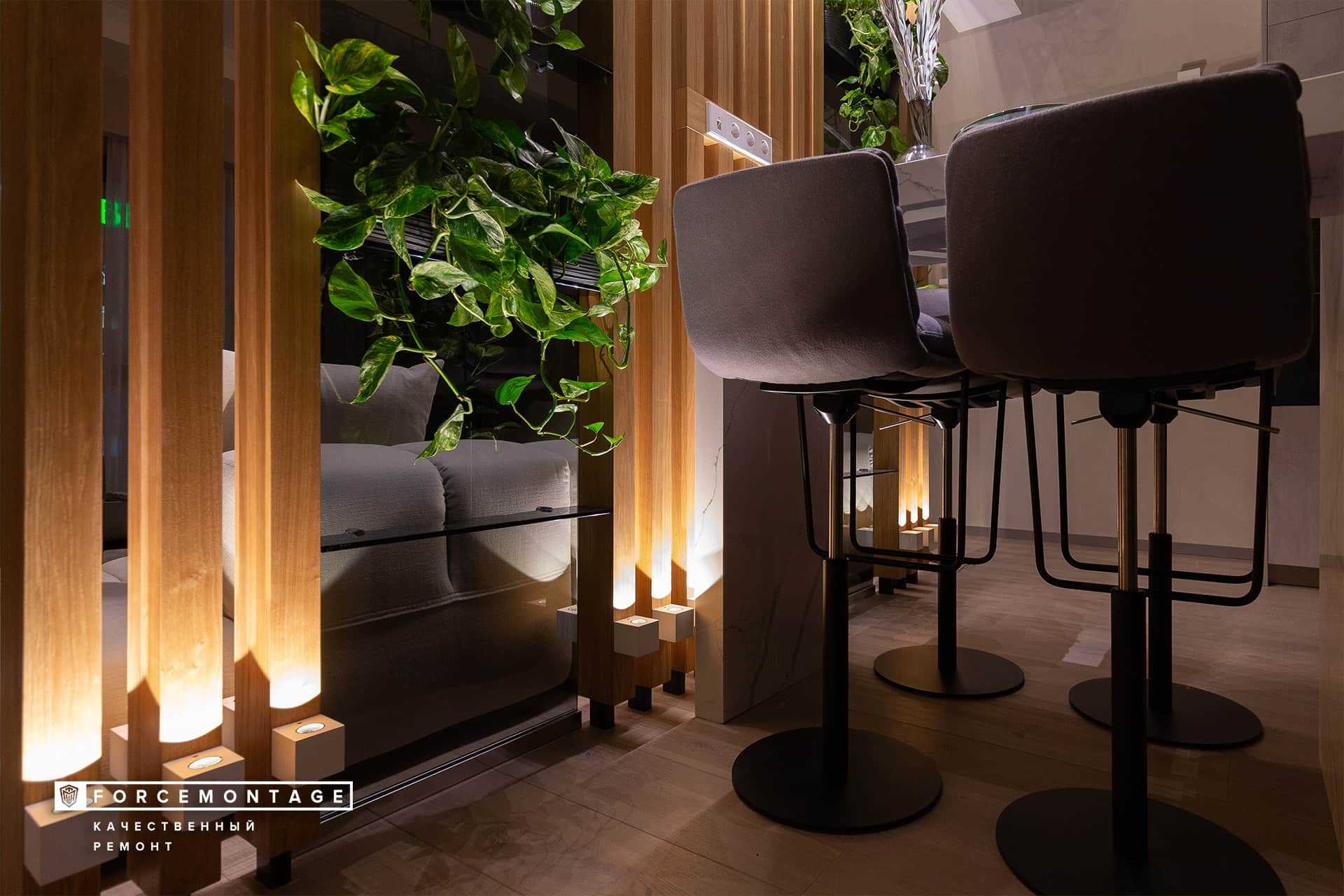 В гостиную удачно пишутся и другие решения: барные стойки, аквариумы, живые изгороди. Последний вариант наиболее интересен при отделении передней части комнаты, в которой расположено большое окно (или несколько).