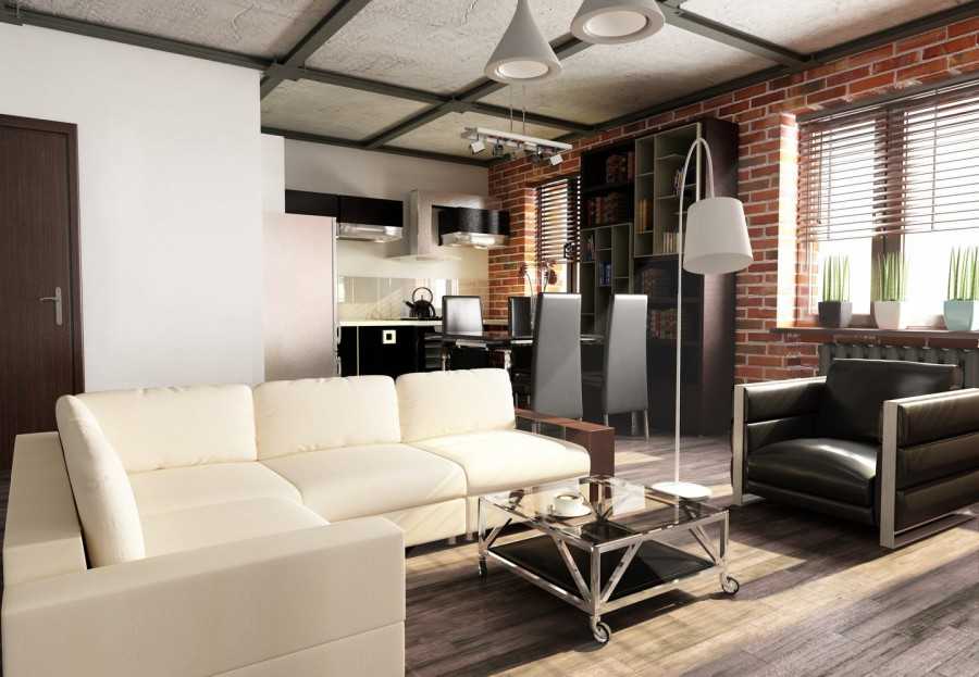 - совмещается гостиная с кухней (не стоит забывать, что рабочая зона кухни должна закрываться хотя бы передвижной перегородкой);