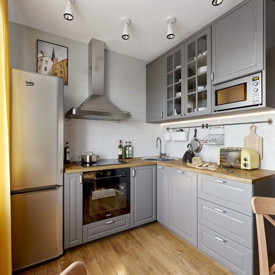 Для оформления дизайна кухни в хрущевке 2021 по-прежнему лучшим вариантом остается установка мебели угловой конструкции. Тогда шкафчики компактно расположатся с одно стороны до оконного проема или стены, а по другой стороне встанут рядом с холодильником. Мойка отлично встанет в углу.