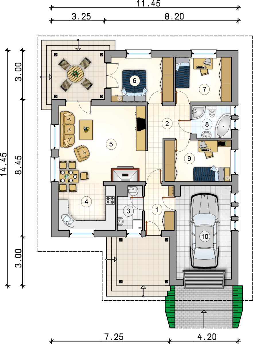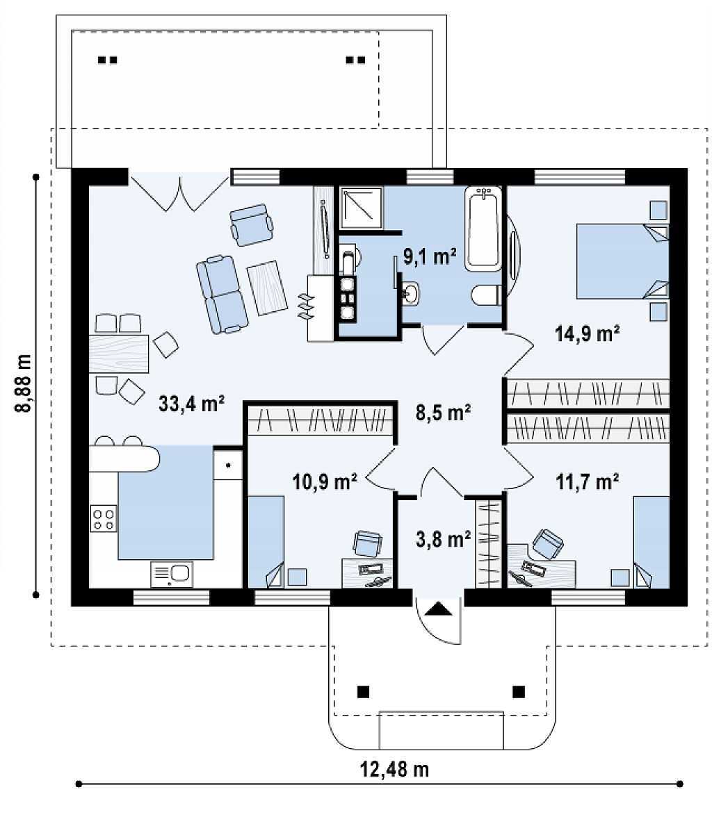 Гараж на две машины предлагает дополнительное место для хранения при необходимости. Скромные квадратные метры и небольшая планировка делают его доступным для строительства.