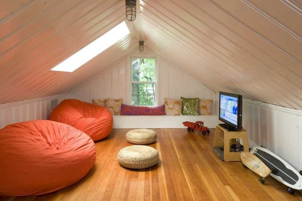 - мансардный этаж можно использовать как небольшую столовую на случай пикника в плохую погоду. Там можно организовать уютную зону отдыха, а хозяйственные люди, возможно, отдадут предпочтение зоне хранения. На мансарде можно будет хранить и садовый инвентарь, и запасы продовольствия, и несезонную одежду — места более, чем достаточно.