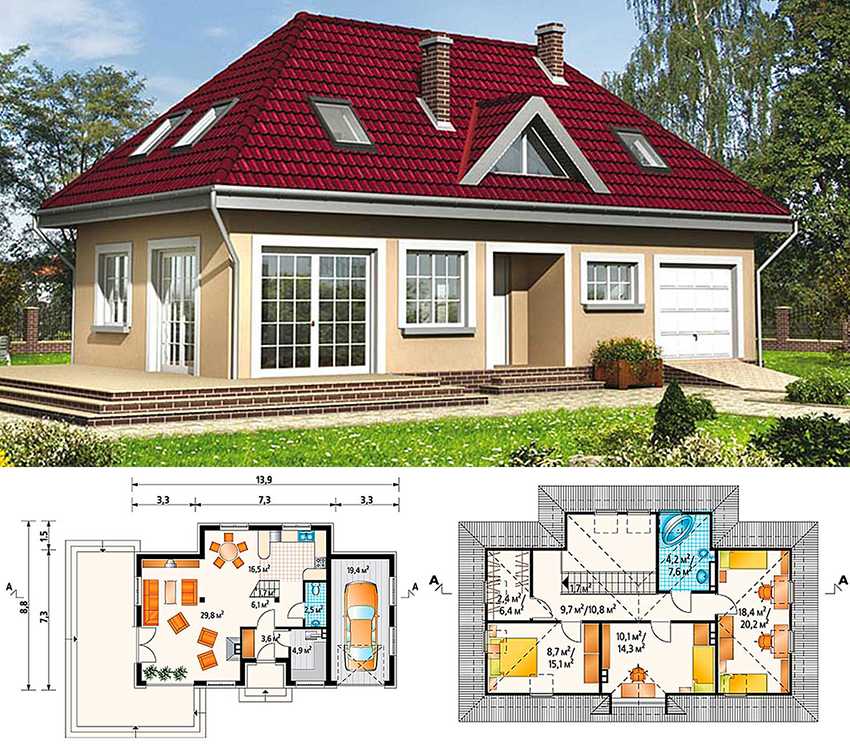 Оформление выполнено в таких же оранжево-белых цветах (с темной крышей). Такой вариант относится скорее к разряду средних домов, в которых по желанию можно разместить несколько спален и даже санузлов.