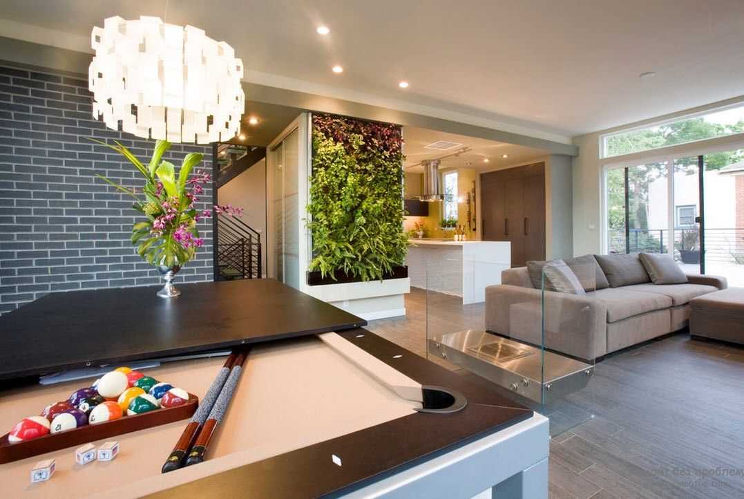 - Вертикальное озеленение. Выглядит такой интерьер неповторимо и очень красиво. Композиции имеют разное содержание, формы, размеры, состоят из специально подобранных растений, выполнены в виде фитокартин, зеленых стен, фитомодулей, инсталляций на потолок, передвижных конструкций. Посадка растений для живых поли- и моностен производится в панели из синтетического войлока со специальными карманами и автополивом, системы с самостоятельным орошением, модули с гидропоникой, с грунтом и вертикальные полки, не оснащенные системой полива. В озеленении внутри дома наиболее часто принимают участие семейство бромелиевых, хлорофитум, сингонинум, сциндапсус и строманта, традесканция и др. Самый простой пример, но практичный вариант для кухни — фитомодуль с полочками под уклоном для выращивания пряностей.