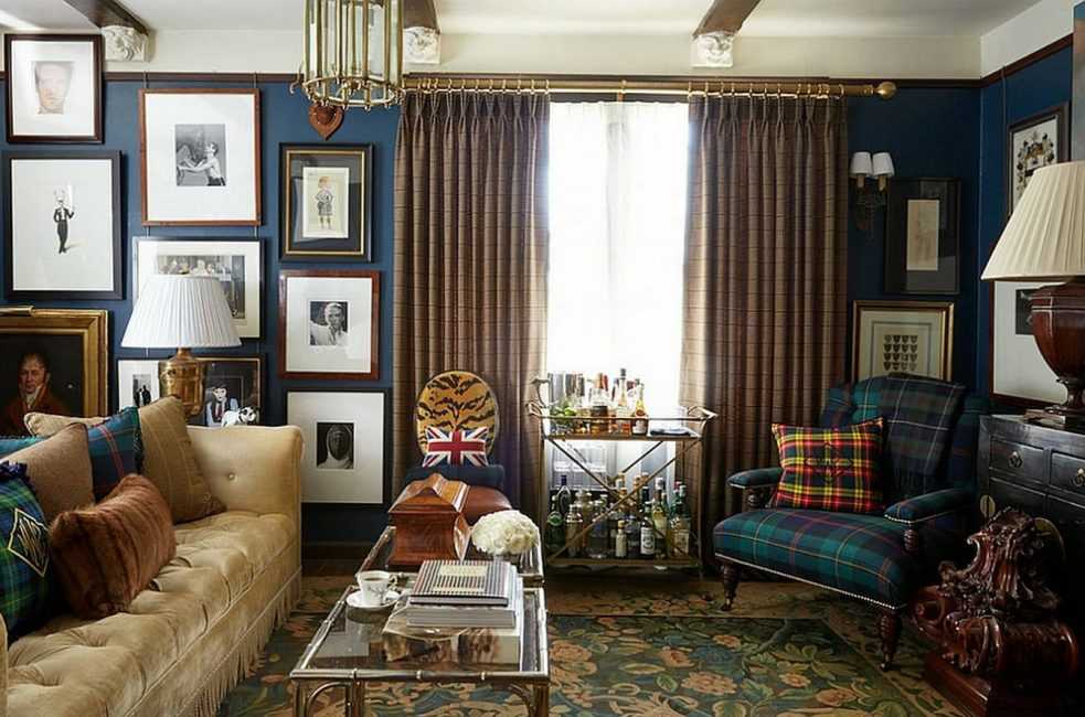 Акцент делается на деревянной мебели из дорогих пород, обязательным атрибутом этого стиля является наличие камина.