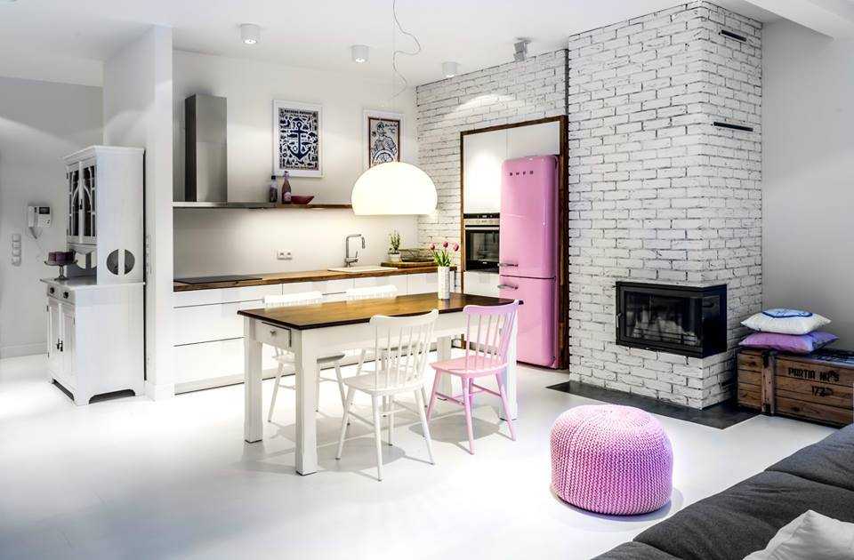 Декоративно отделанные стены с белым кирпичом или и вовсе не обработанной облицовкой – такой необычный и вместе с тем интересный дизайнерский ход претендует стать трендом предстоящего сезона. Светлая мебель делает пространство визуально воздушно-невесомым.