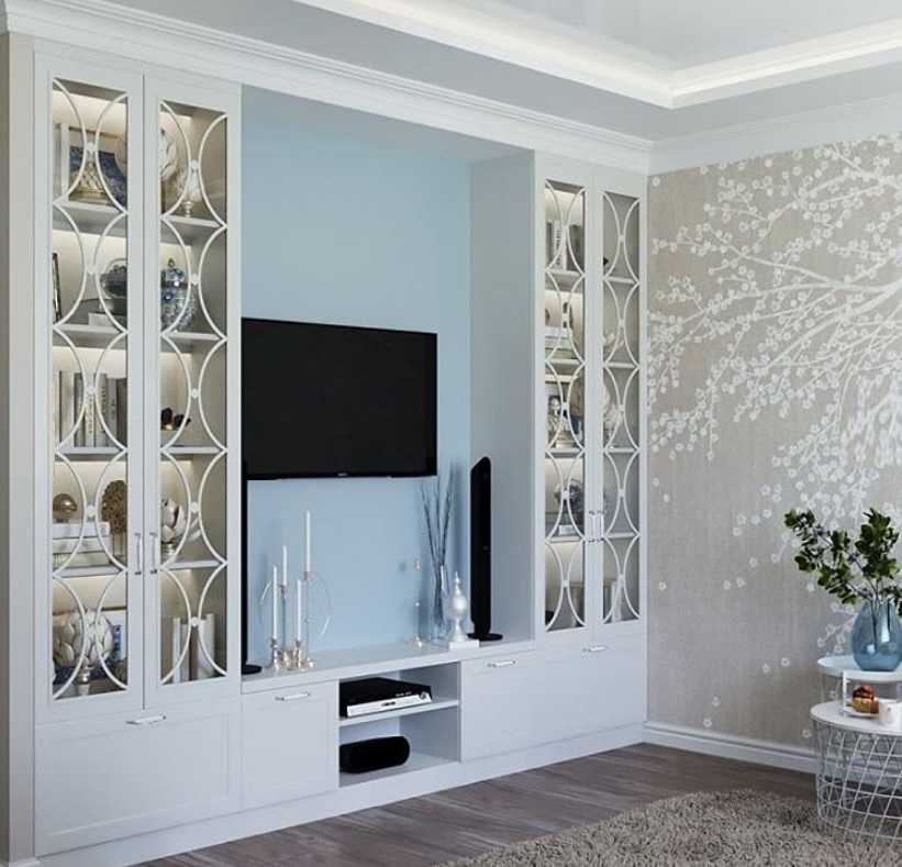 Модульные гостиные в современном стиле также дают много интересных возможностей, когда дело доходит до выбора фасадов. Например, вы можете выбрать частично окрашенные двери или интересные текстуры, которые помогают оживить монохромные композиции. Например, для белой гостиной стоит выбрать контрастный окрас выбранных шкафов или фасадов с трехмерной «алмазной» структурой, которая будет интересно преломлять свет. Стеклянные двери также могут быть хорошим вариантом, если они не расположены близко к самому телевизору. Такие модели могут отражать свет экрана и вызывать неприятный, отвлекающий визуальный эффект.