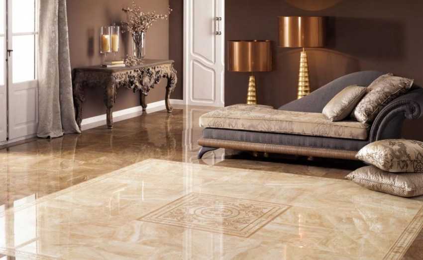 Напольное покрытие в кухонной зоне квартиры должно быть прежде всего гигиеничным, тогда как в гостиной важен комфорт и уют. Используя в одном помещении разные виды отделки пола можно условно обозначить эти две области и подчеркнуть деление расстановкой мебели и легкими металлическими перегородками с зеркальной и мраморной отделкой.