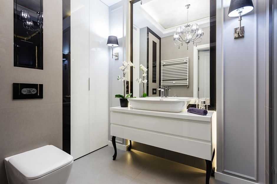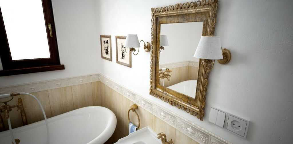 Например, для роскошной классической ванной характерны зеркала прямоугольной (овальной) формы в роскошных рамках, выполненных из дерева или наделенных элементами ковки. Здесь может присутствовать позолота или фрагменты искусственного состаривания.