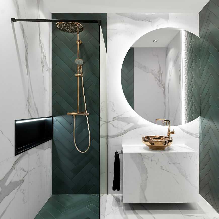Первая ассоциация, наиболее очевидная — стена над раковиной. И это правильно, ведь это еще и удобное и наиболее эргономичное место. В нем мы разглядываем себя, красимся, причесываем волосы. Это первый выбор, и обычно многие начинают с него. Зеркало над умывальником можно «растянуть» на всю стену, чтобы визуально увеличить интерьер. Подобного эффекта вы добьетесь, установив большое стекло от умывальника до потолка. Сдержанные светодиодные ленты с двух сторон идеально вписываются в него. Это хорошее решение, чтобы оптически «приподнять» низкие помещения.