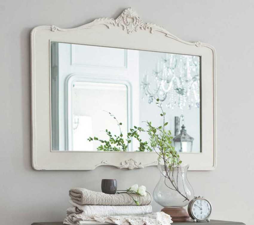 Для стиля прованс трудно придумать что-либо лучшее, нежели зеркало в старинной деревянной оправе, украшенной резным декором. Иногда и сама поверхность зеркала имеет дефекты покрытия, что делает дизайн максимально правдоподобным. Наиболее удачная форма – круглая, но могут присутствовать и другие. Красиво смотрятся зеркальные полотна, расположенные на кованых подставках.