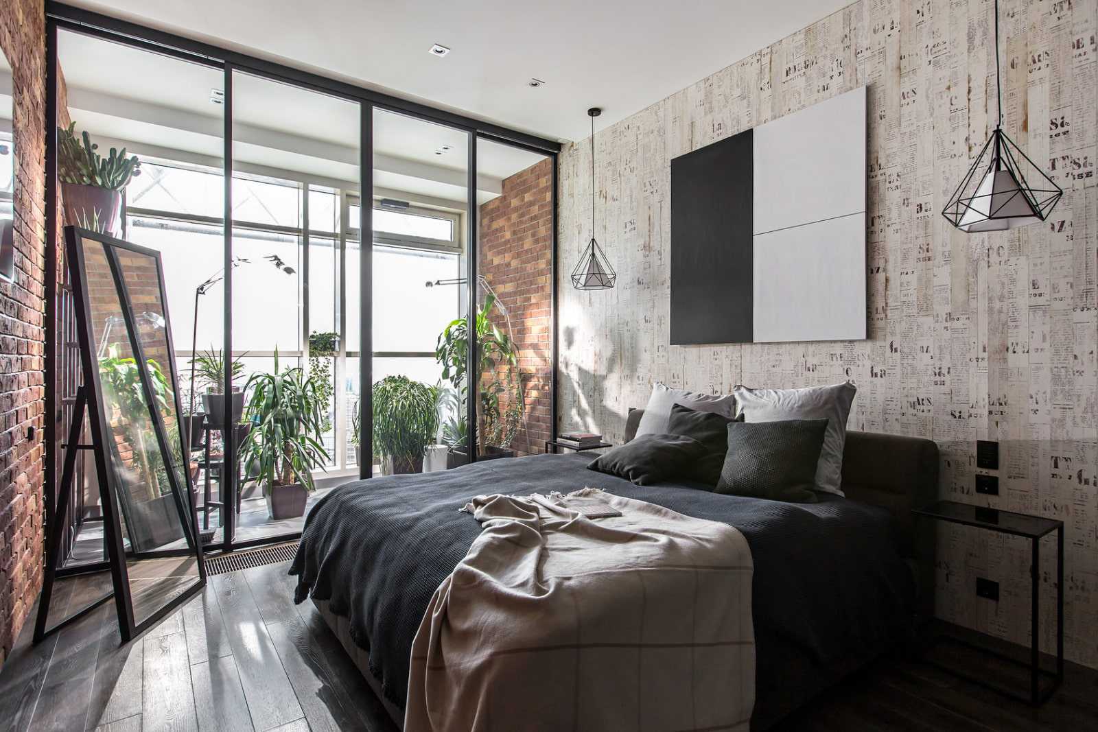 Зонирование зоны сна и гостиной при помощи раздвижной перегородки