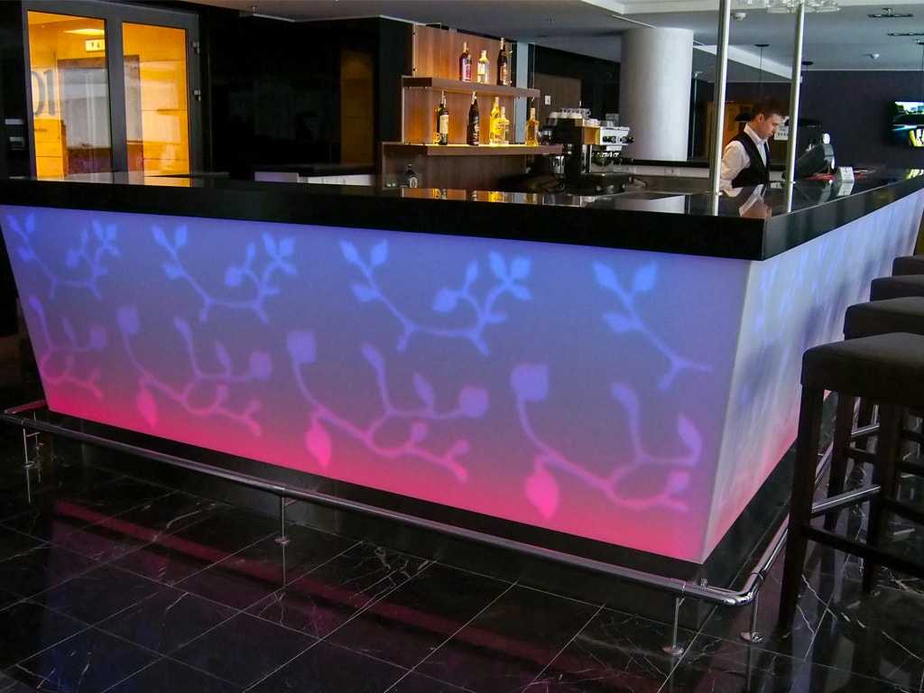Впрочем, не менее выигрышно смотрится и просто стекло со светодиодными лентами — буйство красок вам обеспечено.