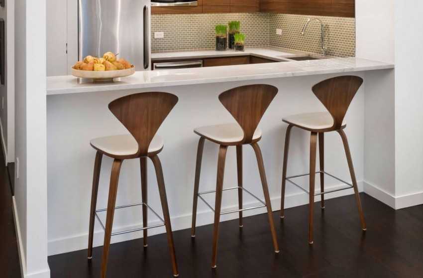 отсутствие спинки. Классический стул для бара – это разновидность табурета на высоких ножках. Такая модель наиболее предпочтительна для обладателей небольших кухонь, так как позволяет без труда спрятать табуреты под столешницу, тем самым освобождая пространство;