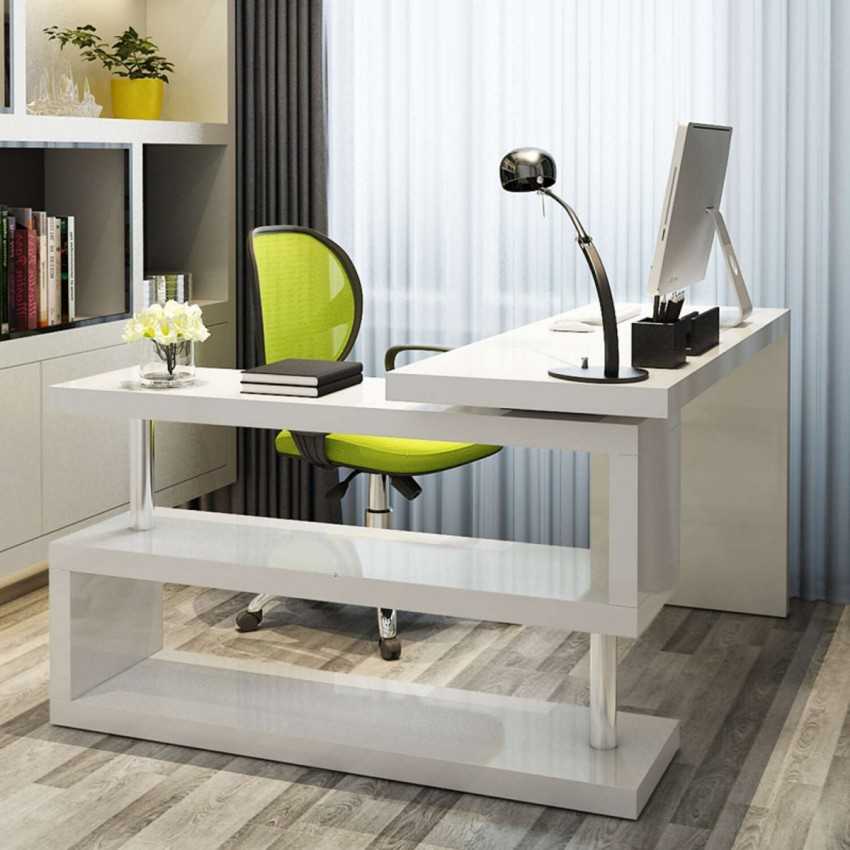 В сочетании с соответствующим декором на открытых полках стол будет притягивать внимание, а работать за ним будет приятно. Более сдержанное, но не менее модное сочетание – глянцевая белая поверхность и глянцевое покрытие, имитирующее рисунок дерева