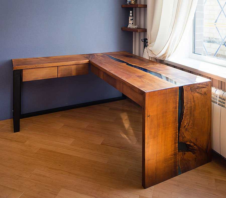 Эргономичная модель. За счет расположения в углу полезное пространство не задействовано. Столешница скошена и обычно сделана с полукруглой выемкой для удобства сидящего. Часто стол дополнен надстройкой из шкафов или стеллажей для хранения аксессуаров. Такие столы часто ставят в комнаты детей и подростков.