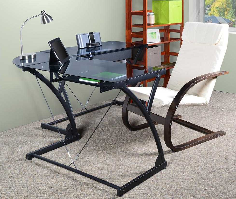 Стеклянный компьютерный стол. Такой стол выглядит стильно, освежает интерьер и придает воздушности. Этот материал практичен, его сложно поцарапать, но он не является достаточно прочным.