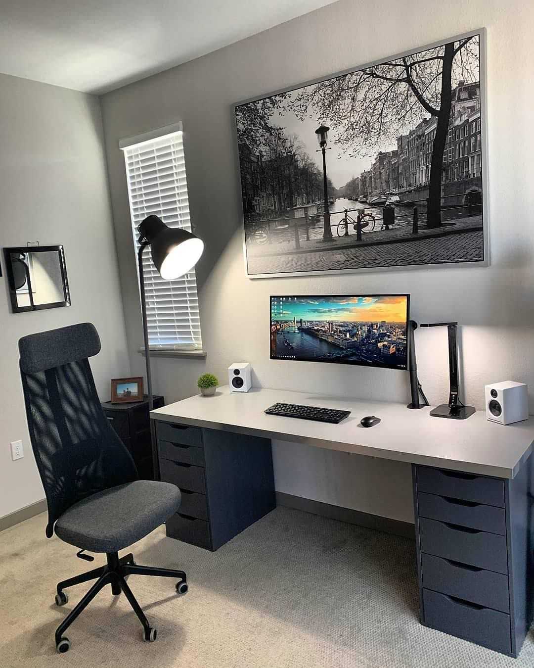 Оснащенный дополнительным пространством для хранения, большой компьютерный стол становится центром рабочей зоны, поэтому очень важно правильно вписать его в существующий интерьер