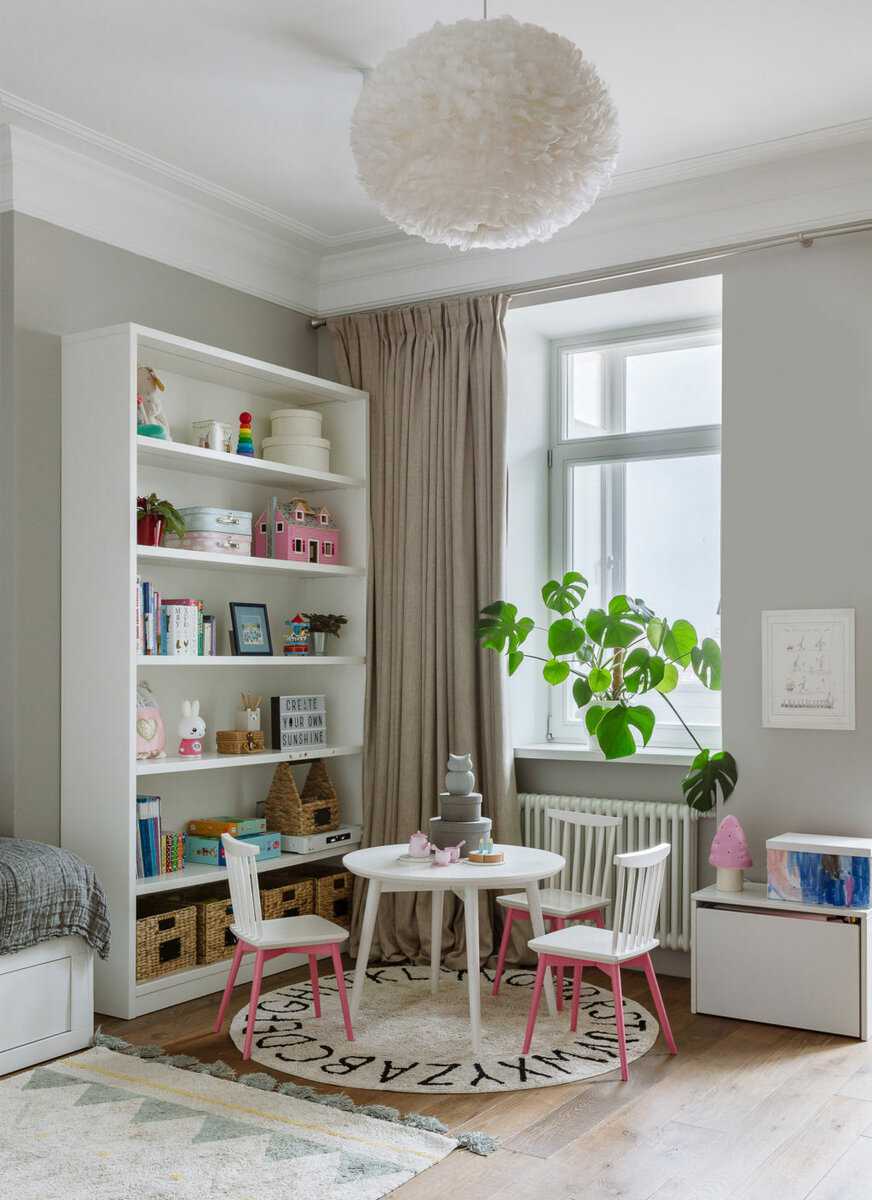 Квартира по проекту Екатерины Артюхиной. Детская. Белый стеллаж, “Столярка Дерево”; детская мебель и плетеные ящики, Pottery Barn Kids; тумба для хранения, Flexa; ковры, Lorena Canals; плафон из перьев, Eos; постер, Maileg; лайтбокс, A Little Lovely Company; светильник-гриб, Egmont Toys; копилка-cова, KG Design; серые коробки, IKEA; краска Zoffany. Фото: Ольга Шангина; Декоратор: Елизавета Шешина.
