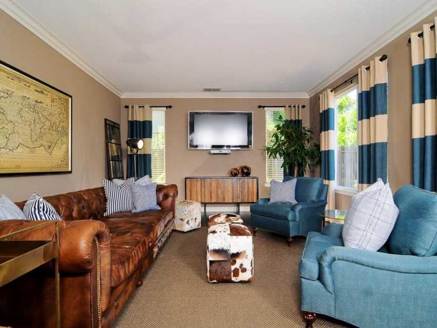 - Популярный сегодня и достаточно простой скандинавский стиль можно сделать оригинальным за счет использования коричневого дивана насыщенного шоколадного оттенка, который удачно дополнят белые кресла.