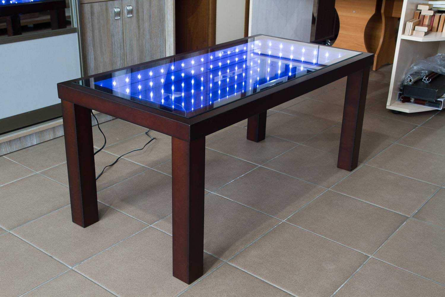 Благодаря такому декору, как подсветка, получается превратить деревянный стол в светящийся центр внимания и наполнить помещение новыми и яркими красками.