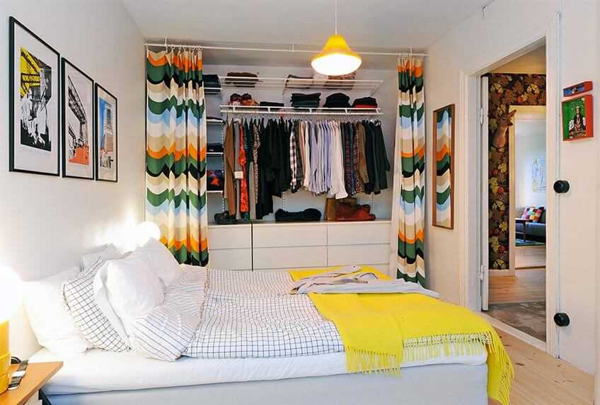Шкаф под цвет стен не загромоздит пространство маленькой комнаты. Он может быть совмещен со стенкой, например, если это модульный гарнитур. Также прекрасное решение — шкаф-купе. Он прослужит много лет и никогда не подведет.