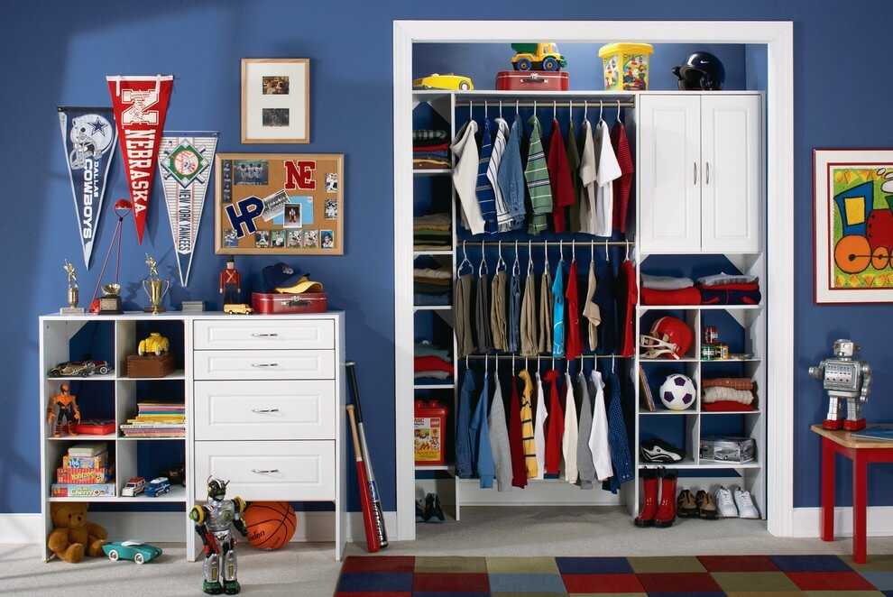 Детский шкаф с полками, штангами и специальными корзинами, обеспечит в детской комнате порядок и высвободит место для игр. Внутренняя наполненность таких шкафов должна соответствовать возрасту ребенка и меняться по мере подрастания, это очень удобно и осуществимо в шкафу-гардеробной, заранее предусмотрев конструкции, регулируемые по высоте. Оптимальным вариантом дверей в детской гардеробной признаны двери-гармошка, они просты в эксплуатации, если используются раздвижные системы, позаботьтесь о прочных направляющих и легком ходе дверных полотен.