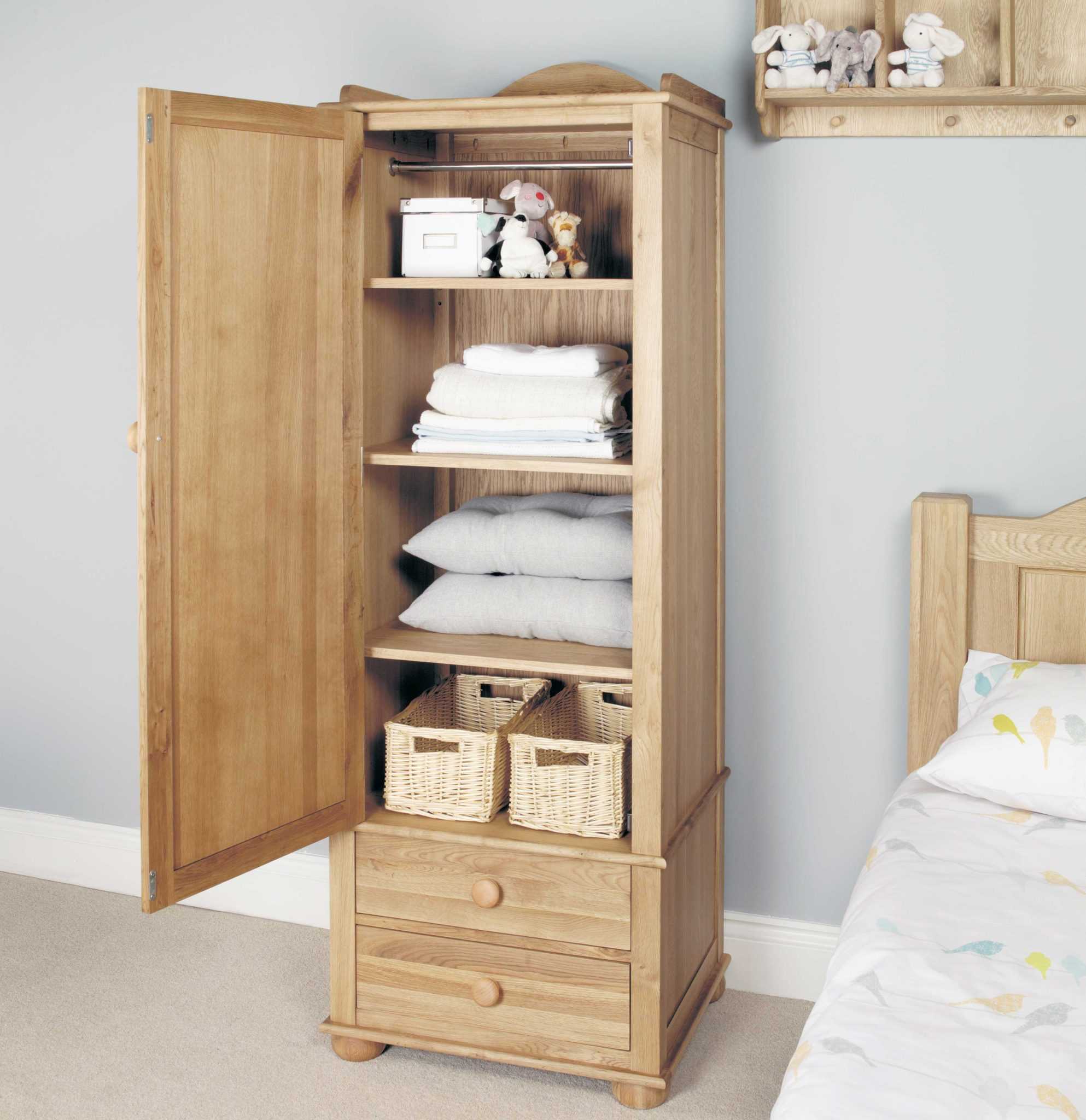 - классические платяные шкафы – высокие конструкции, внутри содержащие основную часть и антресоль. Вмещает много одежды на плечиках. На верхнюю полку кладут несезонную верхнюю одежду или постельные комплекты – вещи, которыми заведует мама ребенка. Нижняя полка будет полезна, если усилить ее фиксацию. Маленький владелец встанет на нее и достанет необходимую вещь. Сам шкаф должен обладать устойчивыми ножками, не шататься.