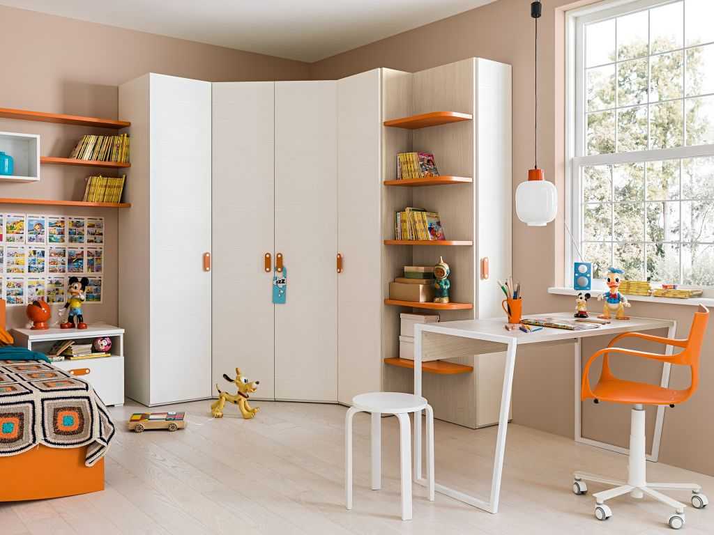 Перед приобретением желательно ознакомиться со всеми вариантами детских шкафов. Угловая мебель отличается вместительностью, компактностью, небольшим весом. В шкафу такой формы достаточно места, при этом его легко можно вписать даже в маленькую комнату, благодаря этому он не теряет популярность. Дверцы у него обычно распашные, хотя встречаются и раздвижные варианты. В детскую комнату лучше выбирать не слишком высокие модели, которые будут удобны малышам. Внутри можно разместить корзины, вешалки, ящики, полки. Также эту модель можно совместить с кроватью, сделав настоящий шкаф-домик. Недостаток мебели – неудобство использования угла внутри него. Распространенные разновидности шкафа по форме: треугольный, Г-образный, радиусный, трапециевидный, асимметричный.