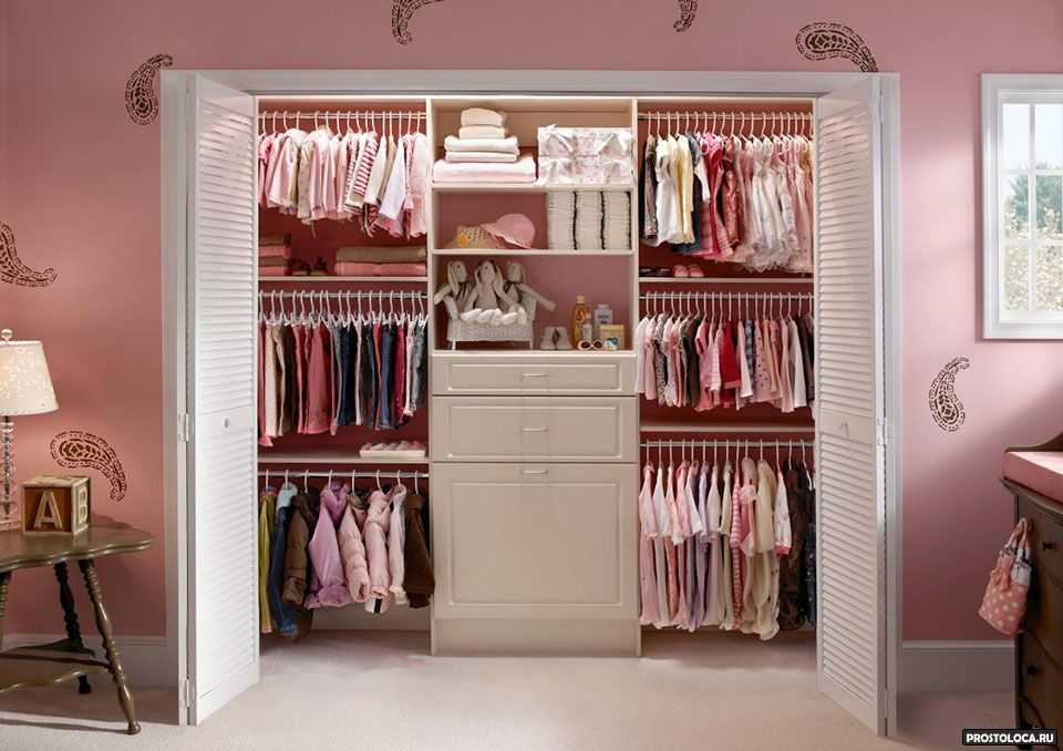 В вопросе внутренней организации шкафов-купе в детской комнате для девочки следует ориентироваться на принцип «чем больше, тем лучше». Также следует предпочесть модели с различными системами хранения.