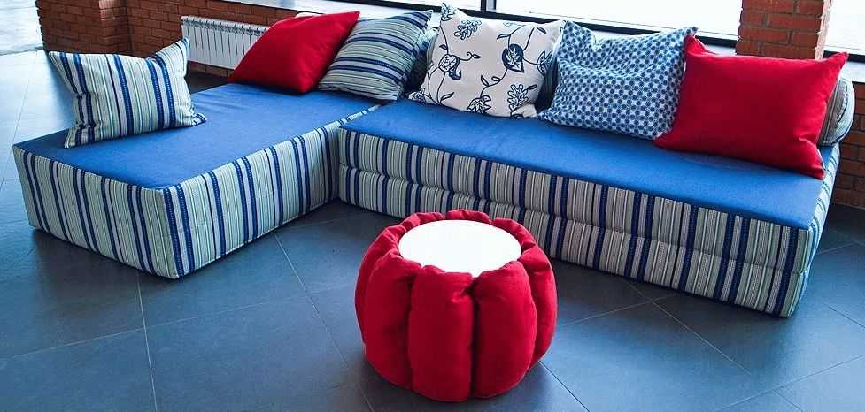 Такие конструкции обычно имеют ровную поверхность для удобства использования и износостойкую ткань обивки для продления срока службы. Но гармонично смотрится такая конструкция только в больших помещениях.