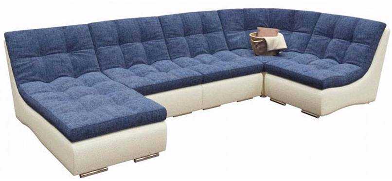 “Монреаль Блю” – модульный экземпляр за 105 500 рублей. Он состоит из нескольких частей, количество и расположение которых можно менять в соответствии с потребностями. Имеет систему “французская раскладушка”: раздвигаются две центральные секции. Прочные материалы позволяют пользоваться этим изделием не один год. Каркас выполнен из дерева, ДВП и ДСП, внутри ППУ. Чехол сочетает светлую экокожу и рогожку.