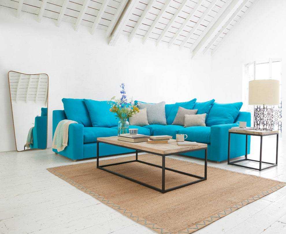 Синие и бирюзовые диваны выглядят ярко, если расположены среди однотонного светлого декора. Оливковый и голубой относятся к холодным оттенкам, они привносят в обстановку нотку свежести.