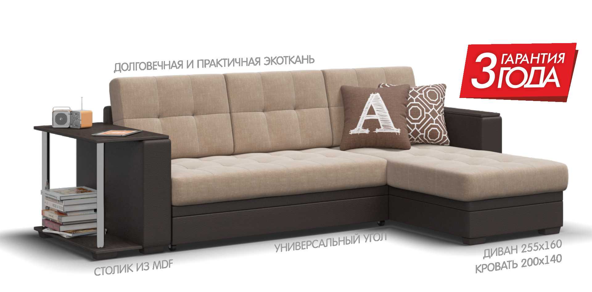 презентабельный внешний вид. Такая мебель выглядит очень стильно. При этом в ней сочетаются как классические элементы, так и новаторский дизайн. В результате, можно обустроить помещение в любом стиле. Тем более что выбор таких диванов достаточно большой; экономия места. Прежде всего, подобная мебель устанавливается в углу помещения, благодаря чему свободное пространство комнаты используется максимально рационально. Кроме того, можно подобрать изделие с подходящими для вас габаритами. Наконец, можно приобрести угловой диван Атланта без столика – это еще более сэкономит вам место; удобный механизм раскладки