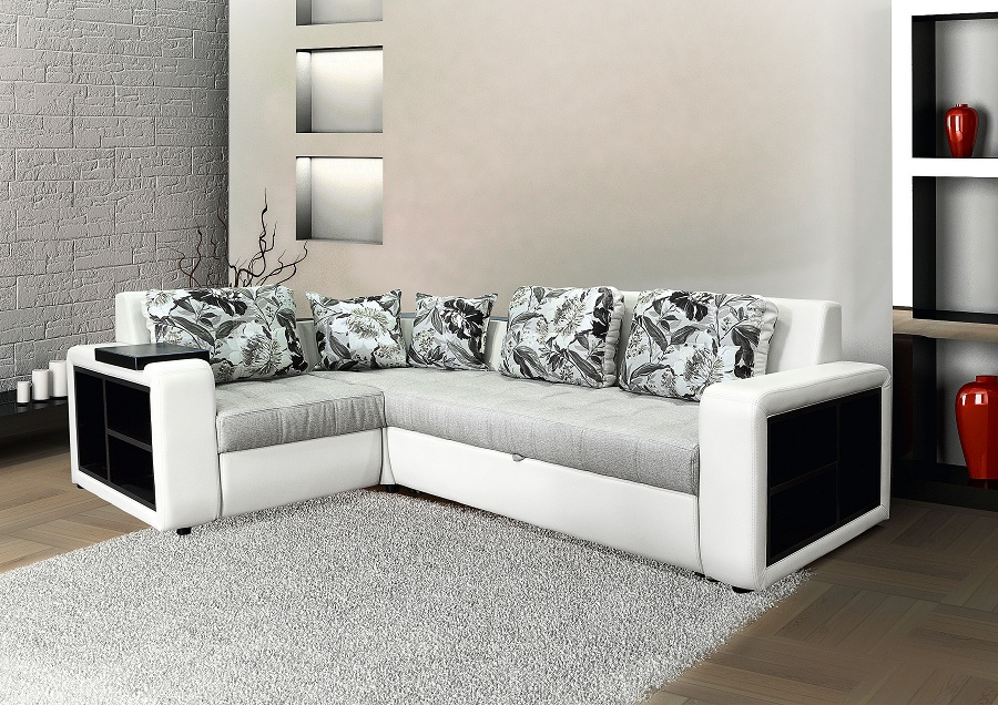 Интересно выглядит угловая модель, если одной стороной она прилегает к стене, а другая расположена поперек комнаты. Создается своеобразный уютный полуостров, который можно дополнить журнальным столиком, креслом или пуфом, а на пол в этой зоне постелить ковер.